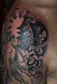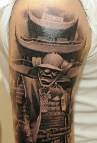 大臂亚洲主题黑白寺庙和武士纹身图案