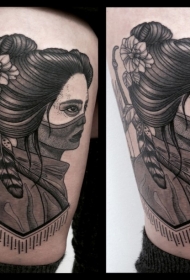 亚洲风格黑白愤怒的女人与剑纹身图案