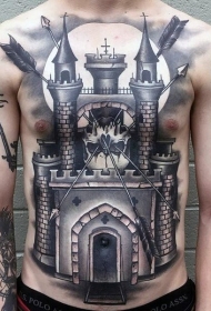 胸部和腹部黑白大城堡骷髅和箭头纹身图案
