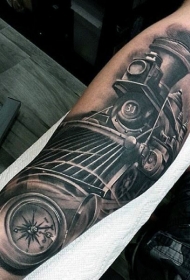 手臂黑白写实的旧火车和钟表纹身图案