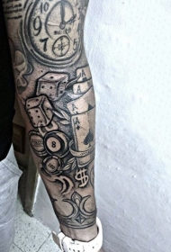 手臂黑白赌博主题扑克牌骰子钟表纹身图案