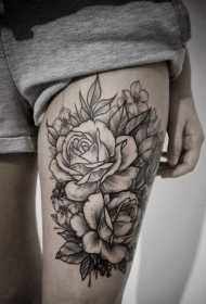 大腿黑白线条大玫瑰纹身图案