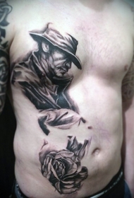 男性腹部黑白西式男子与玫瑰纹身图案