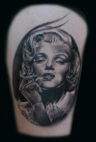 大腿非常写实的黑白吸烟玛丽莲梦露肖像纹身图案