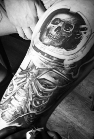 大腿黑白写实的太空头盔骷髅骨架纹身图案