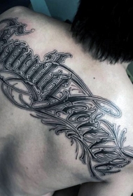 背部巨大的黑白美妙字母纹身图案