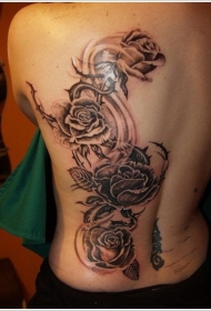 背部华丽的黑白大玫瑰纹身图案