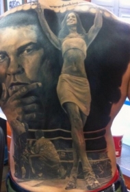 非常逼真黑白拳击主题人物肖像满背纹身图案
