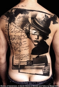 背部神奇的艺术风格黑白女人字母和乌鸦纹身图案