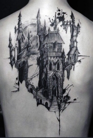 背部黑白幻想城堡纹身图案