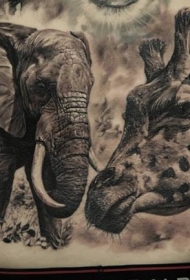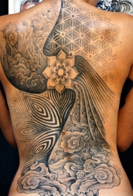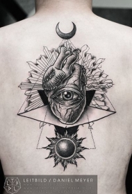 背部黑白点刺神秘眼睛与蝴蝶几何纹身图案