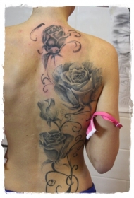 背部美丽的黑白玫瑰藤蔓写实纹身图案