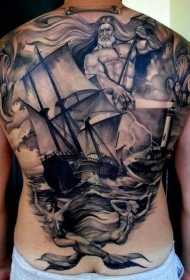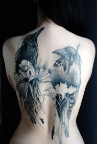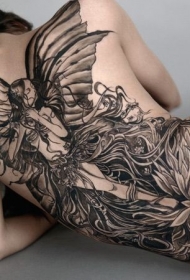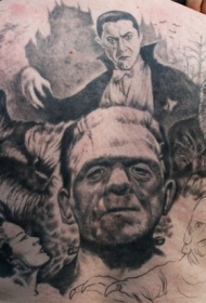 背部惊人的黑白写实恐怖电影人物纹身图案