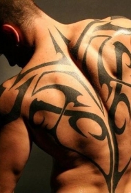 背部点刺部落风格黑白几何与蝙蝠纹身图案