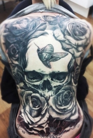 背部惊人的大面积黑白玫瑰与骷髅纹身图案
