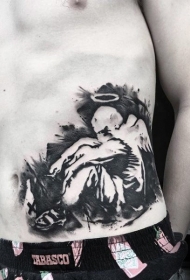 腰部抽象风格黑白天使纹身图案