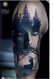 大臂彩色神秘女人与黑暗森林纹身图案