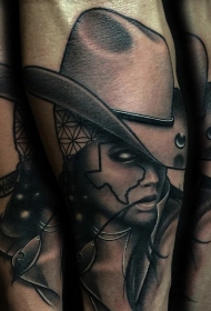 小臂new school黑白女牛仔肖像纹身图案