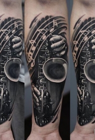 小臂写实风格黑白萨克斯和音符纹身图案