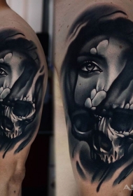 大臂恐怖风格黑白妇女脸和骷髅纹身图案