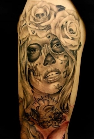 墨西哥式黑白女性肖像玫瑰纹身图案
