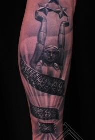腿部写实风格黑白森林狼和印度人像纹身图案