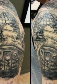 肩部纽约主题的黑白城市火车和地球纹身图案