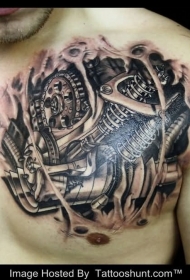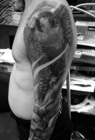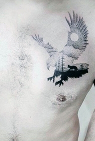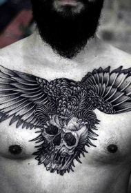 飞行鹰与人类骷髅黑白胸部纹身图案