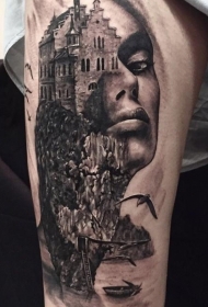 大腿黑白城堡岩石与女性肖像纹身图案
