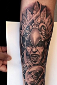 小臂黑白部落祭祀和骷髅纹身图案