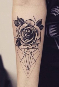 玫瑰花和几何线条黑色线条点刺手臂纹身图案