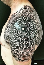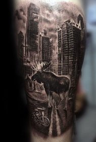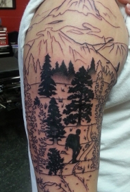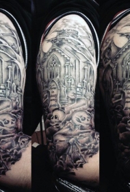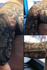 大臂令人毛骨悚然的黑白骷髅与墓地纹身图案