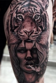 大腿令人印象深刻的黑白部落妇女和虎皮纹身图案
