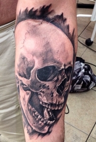 小臂张开嘴巴的现实骷髅与黑色阴霾纹身图案