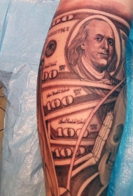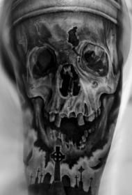 手臂黑白损坏的骷髅结合黑暗墓地纹身图案