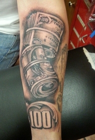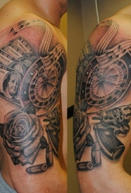 大臂黑灰手枪和金钱玫瑰棋牌纹身图案