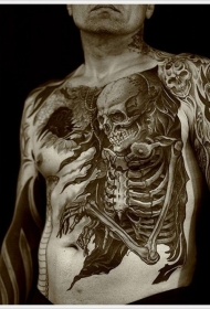 胸部和腹部逼真的黑白骷髅骨架纹身图案
