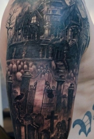 手臂大型黑白恐怖风格废弃的房子与墓地纹身图案