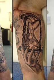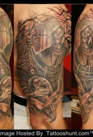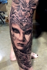 手臂黑白邪恶武士头盔与可爱的花朵纹身图案
