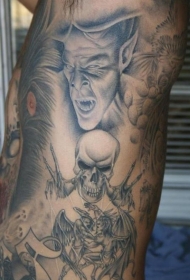 胸部神秘的黑白恶魔肖像与骷髅和心脏纹身图案