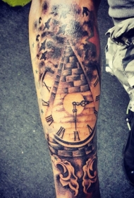 小臂神秘设计的黑白旧时钟金字塔纹身图案