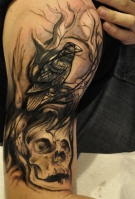 手臂奇妙的黑白线条乌鸦与骷髅纹身图案