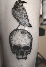 大腿黑色点刺乌鸦与骷髅纹身图案