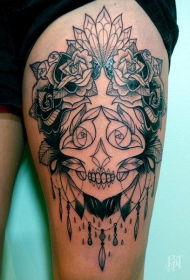 大腿黑色线条墨西哥人像与花卉纹身图案