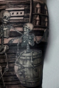 大腿印象深刻的黑灰骨架与啤酒纹身图案