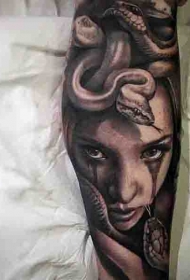 腿部惊人的黑灰怪物美杜莎头像纹身图案