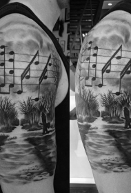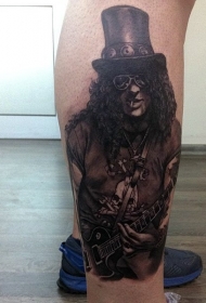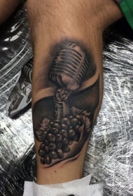 小腿不寻常的结合黑灰麦克风与葡萄纹身图案