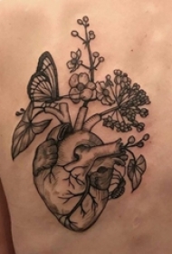 男生背部黑灰素描点刺技巧创意心脏花朵纹身图片