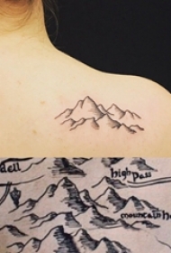 女生背部黑灰线条素描创意文艺山脉风景纹身图片