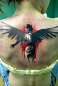 女生背部黑色素描点刺技巧翅膀纹身图片